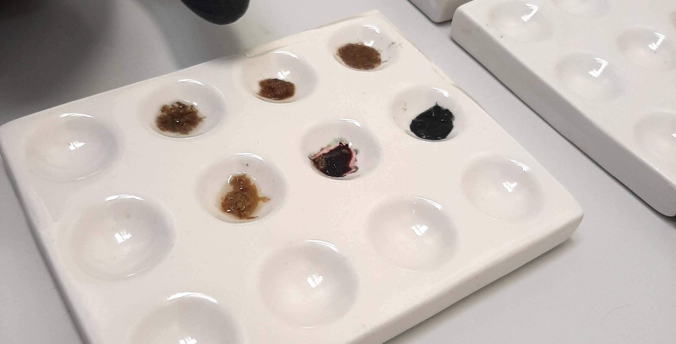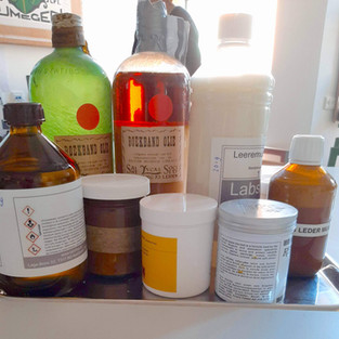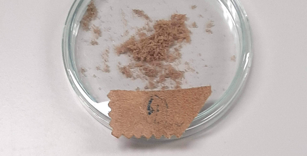 Wednesday morning was spent in lab coats. Each of us were given a leather sample which we then had to test for tanning agents. We tested for vegetable tannins, gallic tannins, and condensed tannins. The flesh side of the leather was scrapped to create bits of sample fibers which were then subjected to tests.