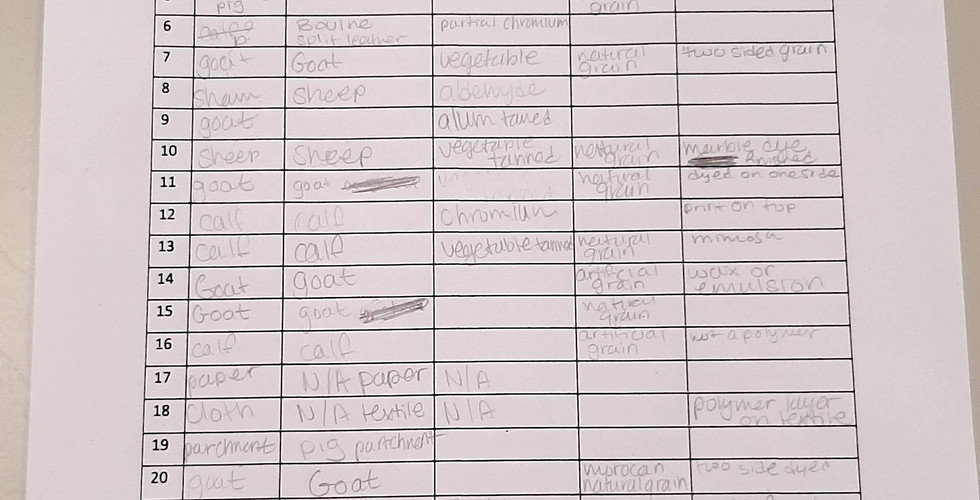 Monday was spent primarily on reviewing last years' material on leather as well as introducing more information on the history of tanning methods. The second half of the day was spent on identifying the species of animal used for various leather samples. We also tried to identify if the samples had natural or artificial grains.